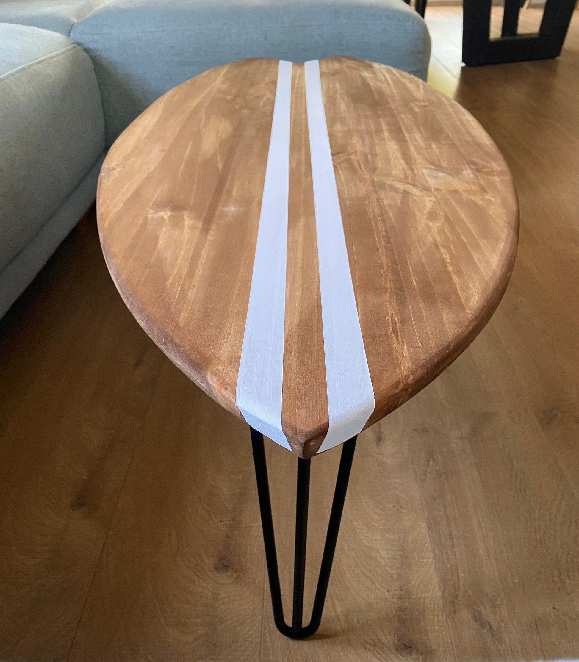 Table basse en forme de planche de surf réalisée avec du bois de Pin.